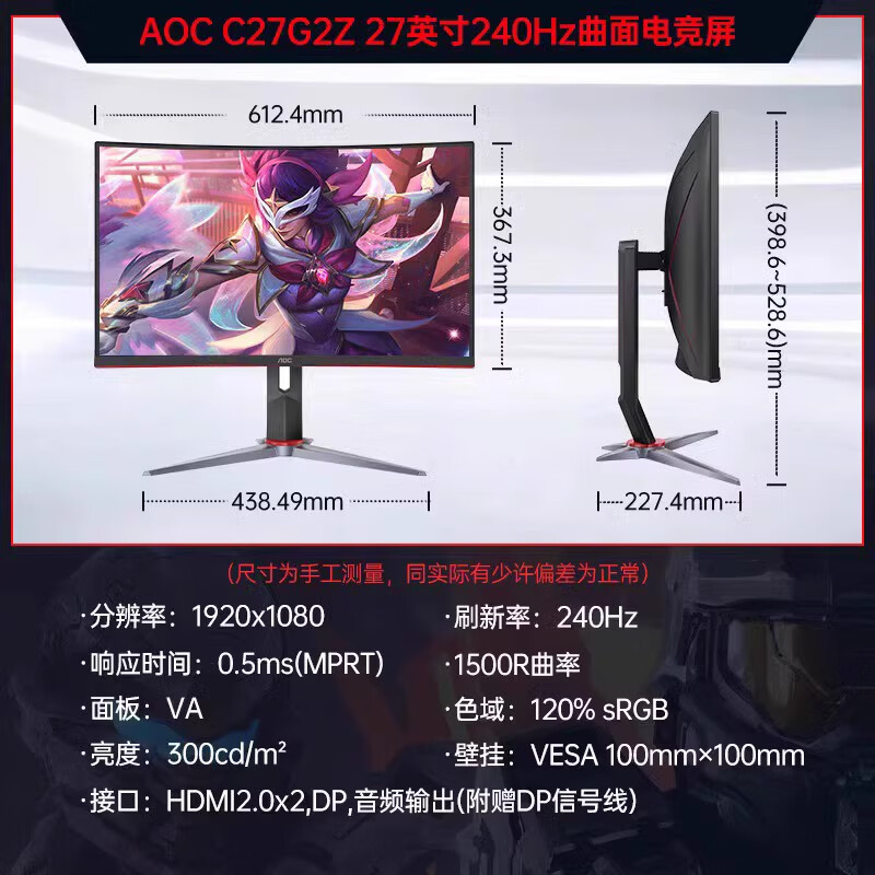 AOC C27G2Z 27寸 曲面 VA1500R屏 240Hz 液晶显示器