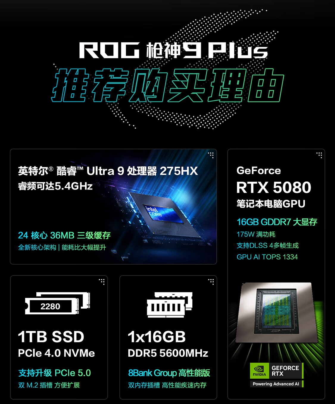 枪神9 PLUS G815LM275( 枪神9P/ U9-275HX/16G/1T/RTX5080-16G/18寸/2.5K/240Hz)