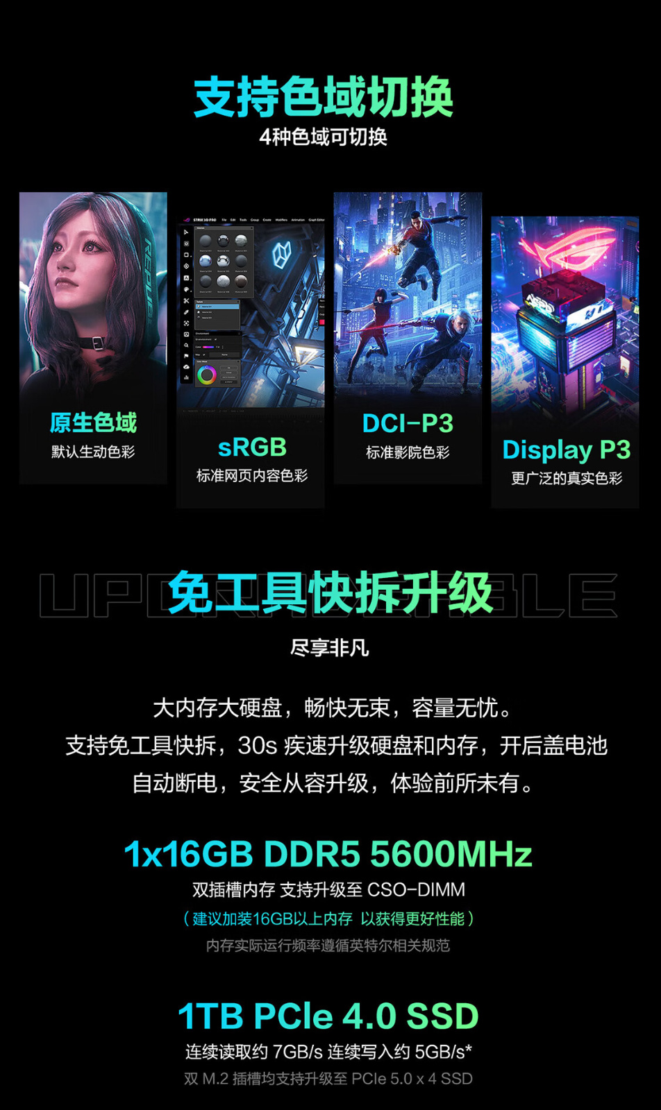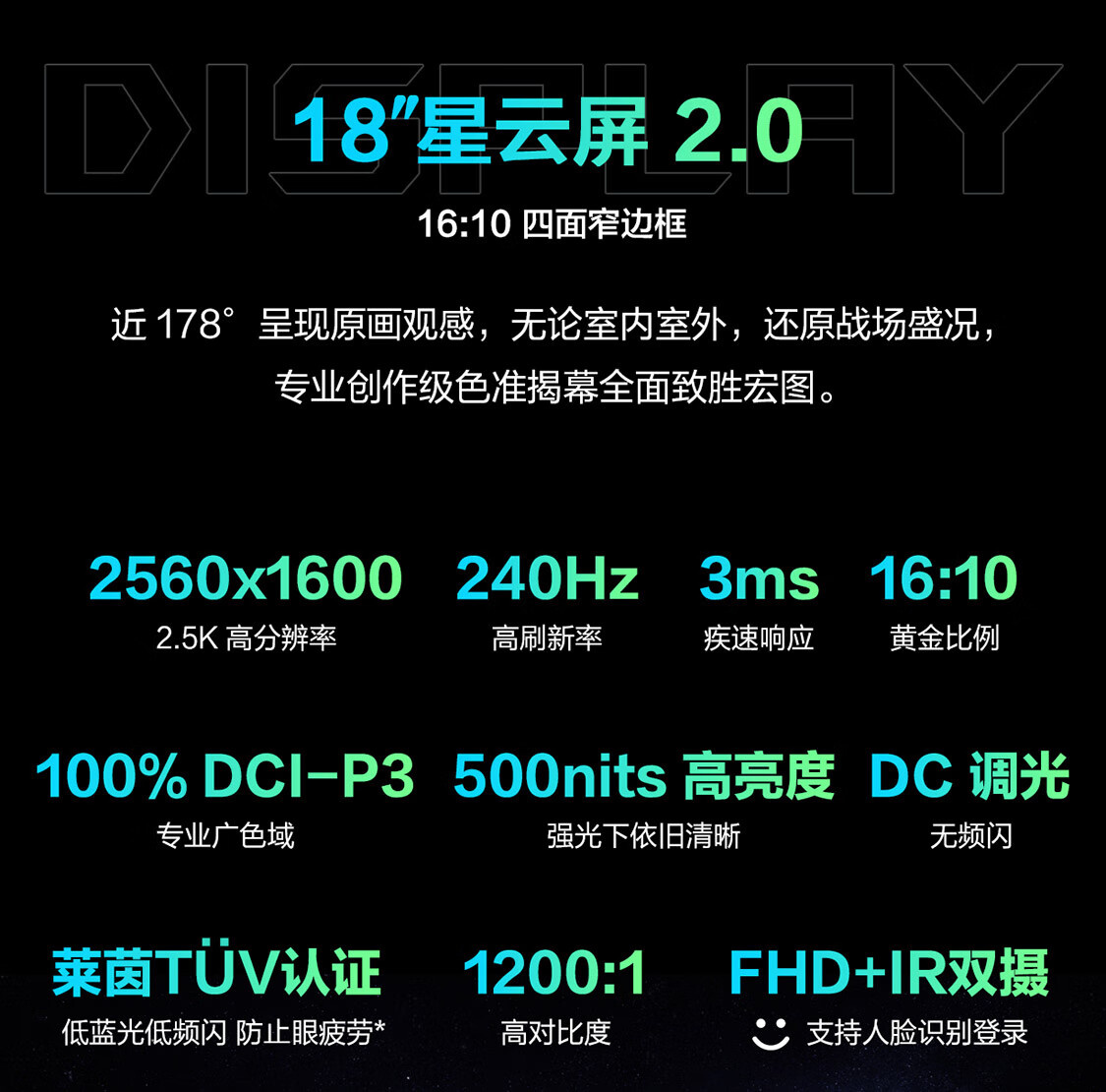 | 屏幕特性 | 高分辨率(2K以上),高刷新率(120HZ以上, 高色域(100%sRGB) |