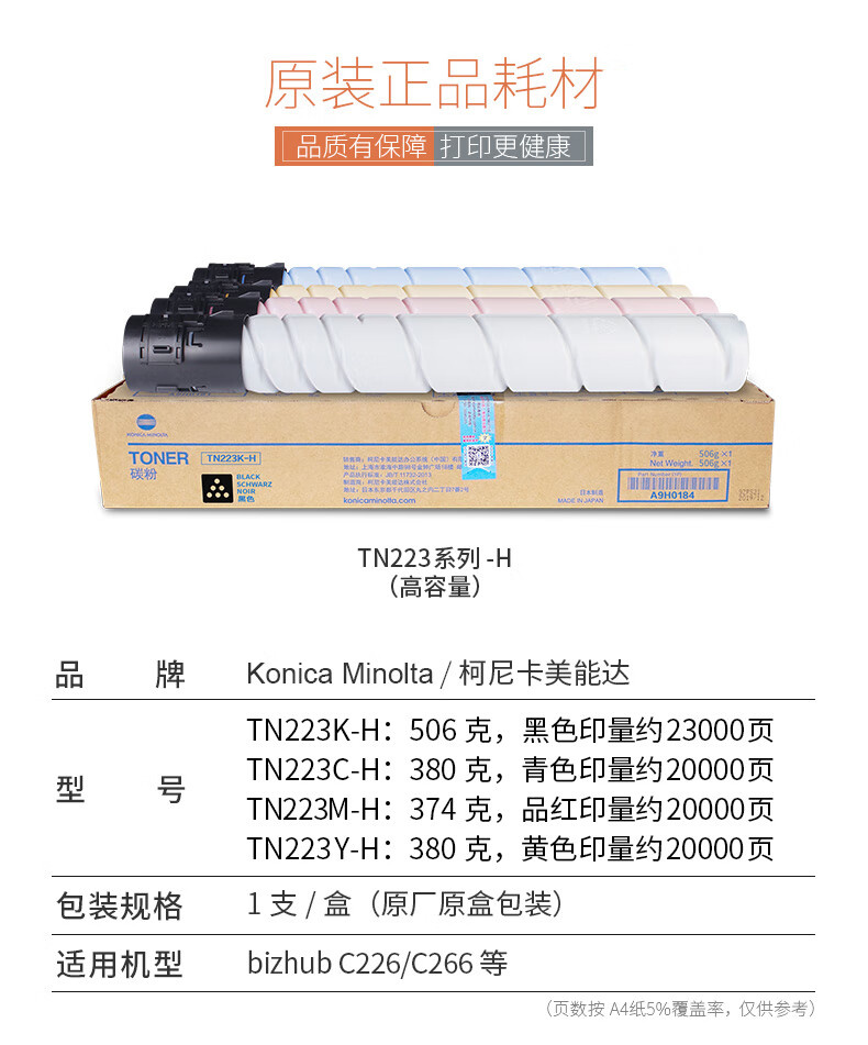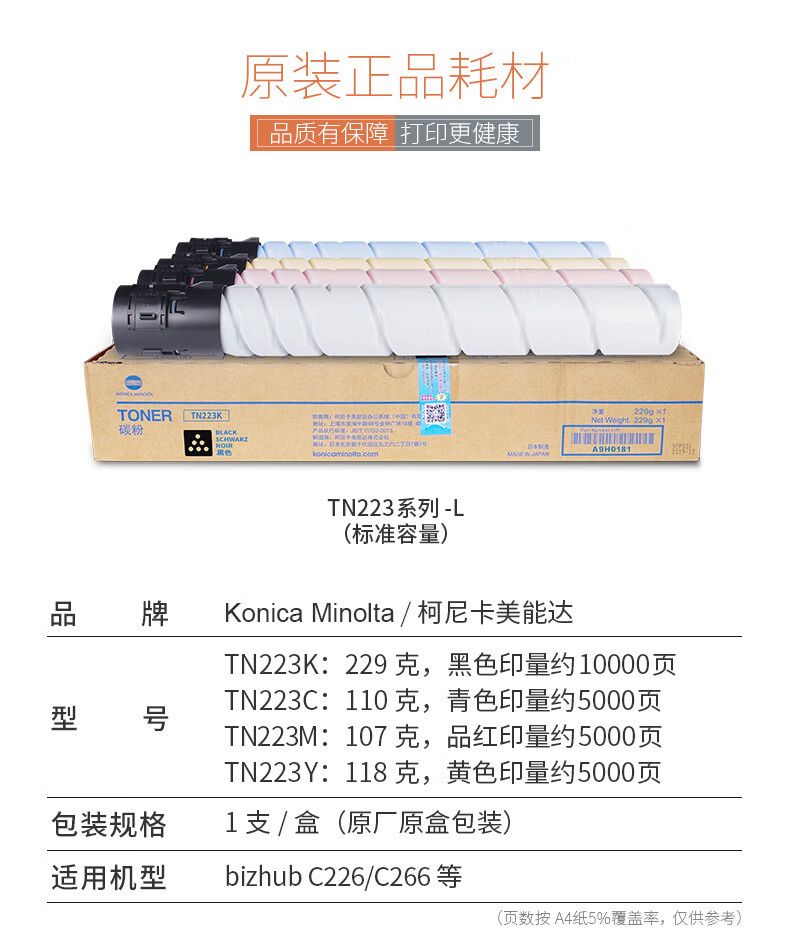 原装柯尼卡美能达TN-223H高容黄粉盒适用于C226 C266
