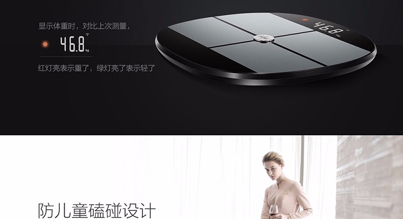 精准测量体重、BMI、脂肪,肌肉、骨骼、水分六项身体数据监测,全面测量健康,WIFI同步数据,微信管理,四人共享,智能识别,高颜值、低功耗,超长待机250天。