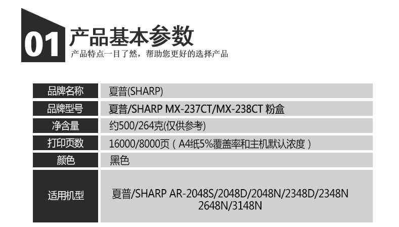 夏普原装 MX-238CT 黑色墨粉 264g/8500张 适用机型:AR-2048S/2048D/2348D/2048N/2348N/2648N/3148N/2441X/2221R