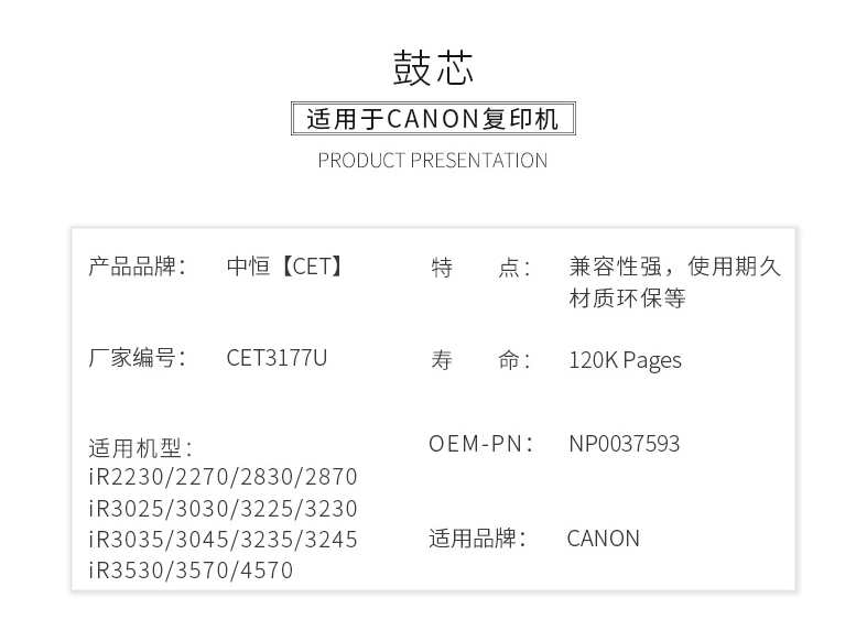 中恒(CET) IR2270/3030/2830/3570/4570单鼓(长寿命)硒鼓芯单鼓感光鼓适用于佳能复印机