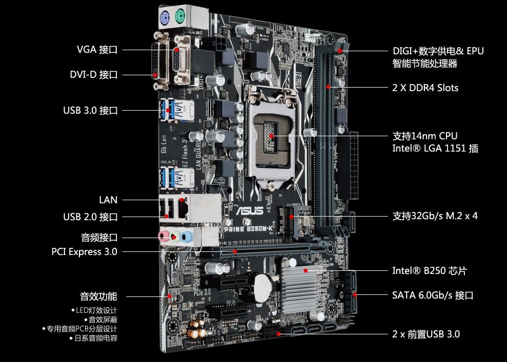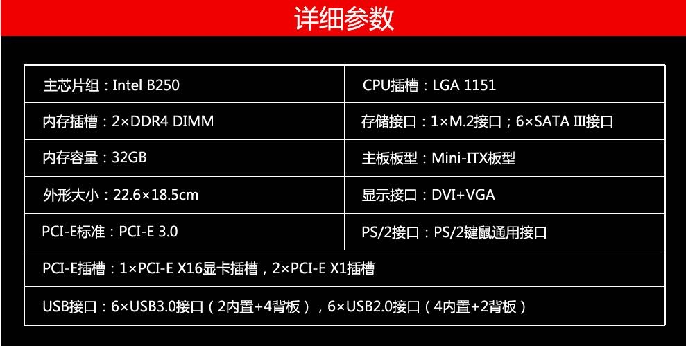 2×DDR4 /1×PCI-E X16/2×PCI-E X1/ M.2/ DVI+VGA/ 2×PS2/ 4×U3/ 2×U2/ 网卡/3×音频