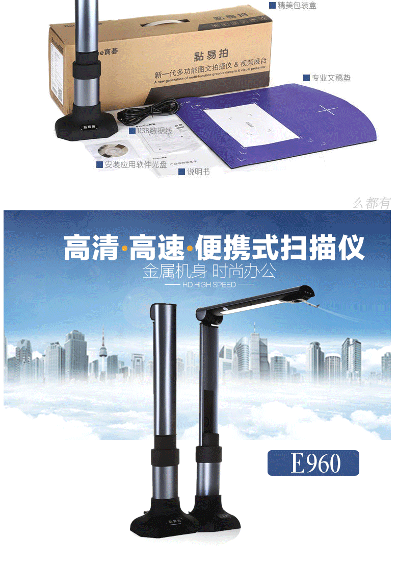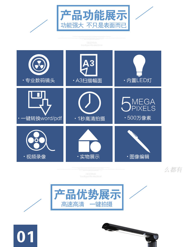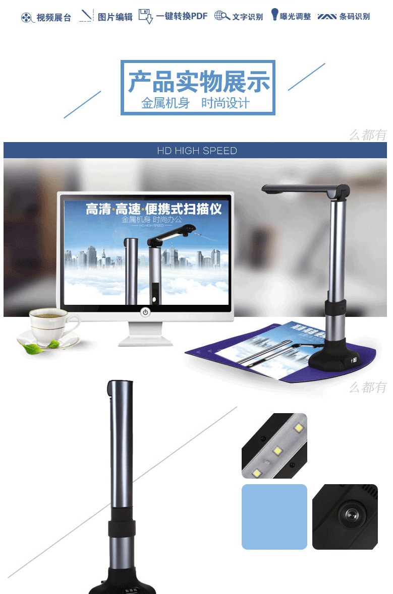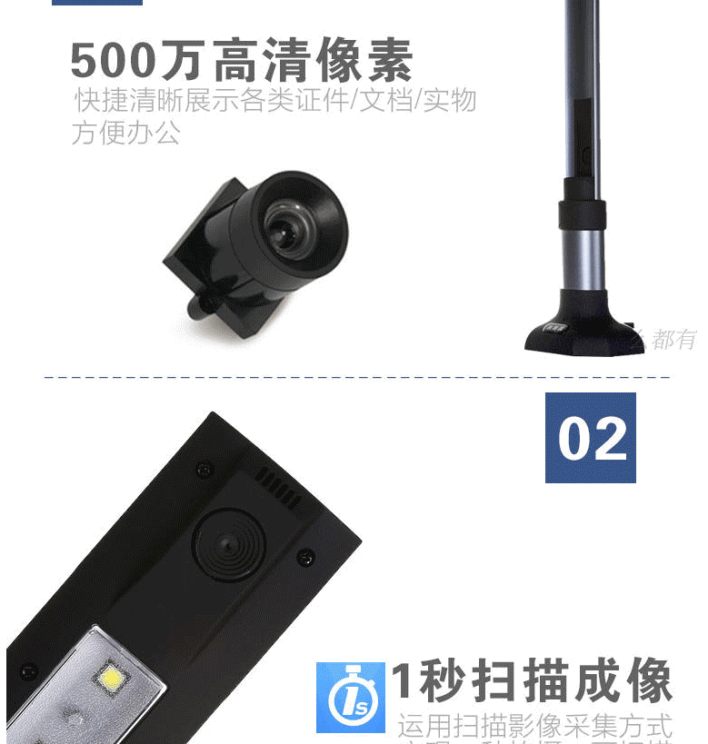 | 其它特点 | 1、A3大幅面文档拍摄高速高分辨率文档拍摄,办公更方便 采用高性能高分辨率CMOS传感器.只要轻轻”一键”点击鼠标即可完成文件或实物的拍摄存储.文档可以是A3、A4、A5、A6尺寸的.即便是大幅面的文 |