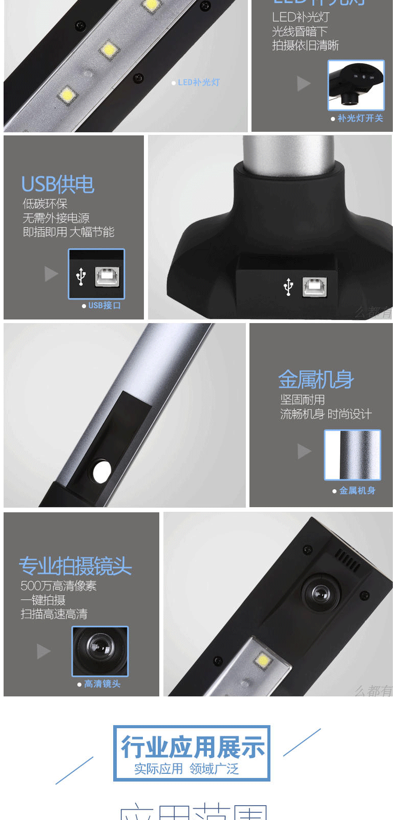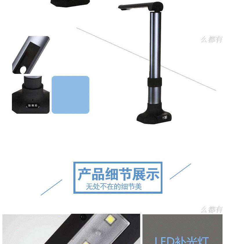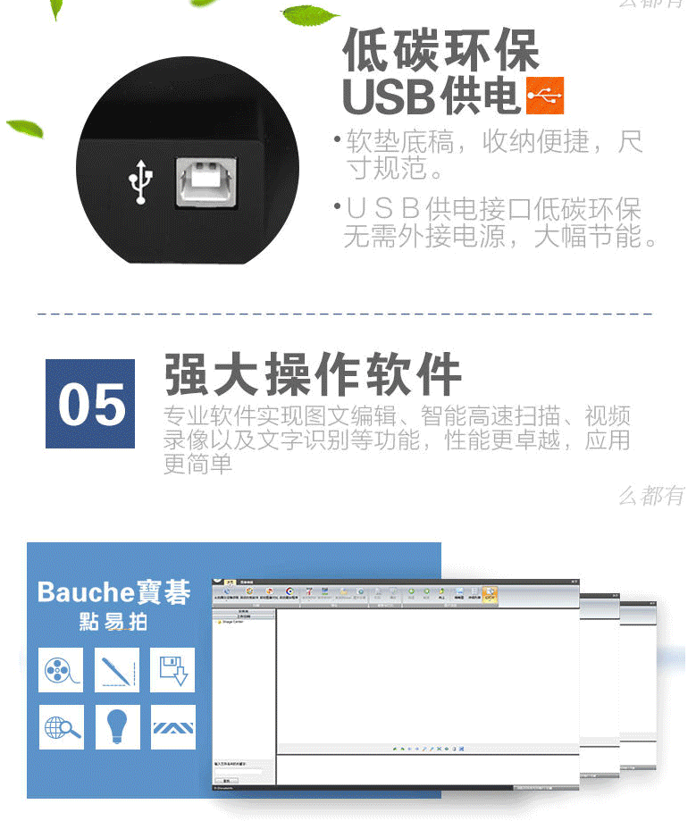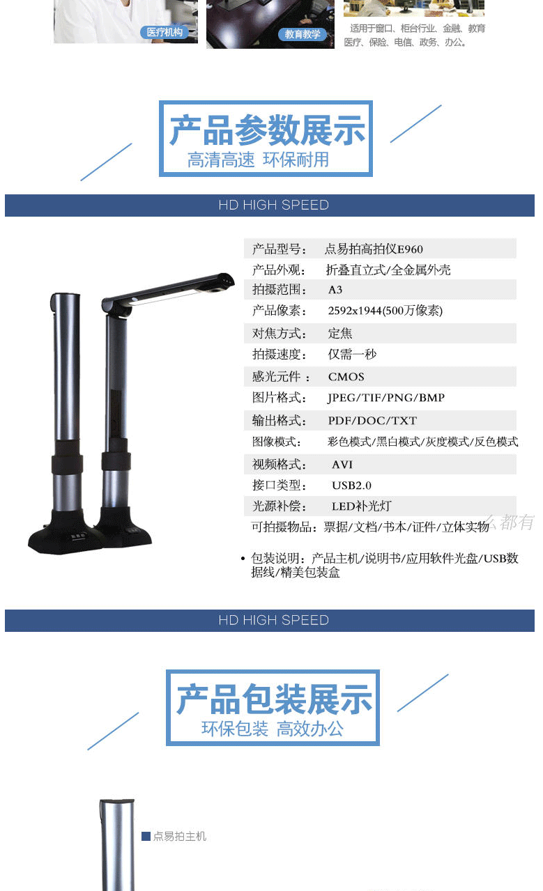 | 其它特点 | 1、A3大幅面文档拍摄高速高分辨率文档拍摄,办公更方便 采用高性能高分辨率CMOS传感器.只要轻轻”一键”点击鼠标即可完成文件或实物的拍摄存储.文档可以是A3、A4、A5、A6尺寸的.即便是大幅面的文 |