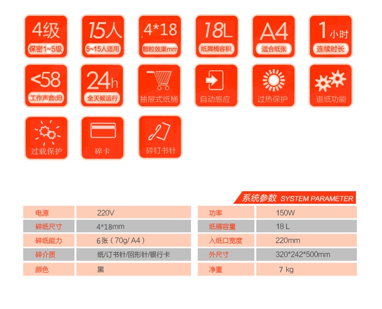 5级保密 可碎三钉一卡,单次碎纸能力5张 ,连续工作时间:40分钟