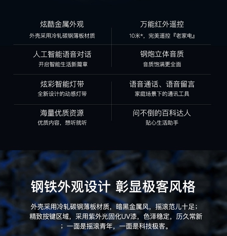 百度旗下人工智能助手 一个人的金属乐队,炫酷金属外观,彰显极客风格;万能红外遥控,传统普通家电秒变智能;钢炮立体音质,饱满更全面!