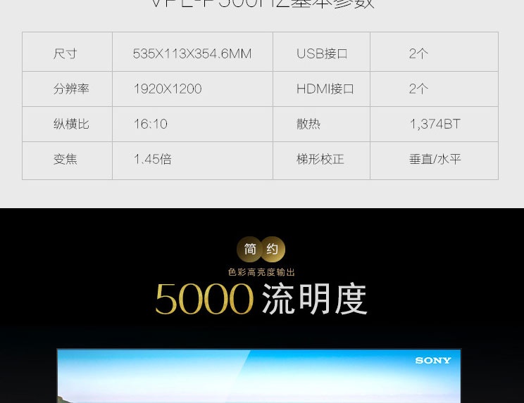 3LCD投影机,5000流明,对比度:500000:1,标准分辨率:1920*1200,HDMI接口 VGA接口。