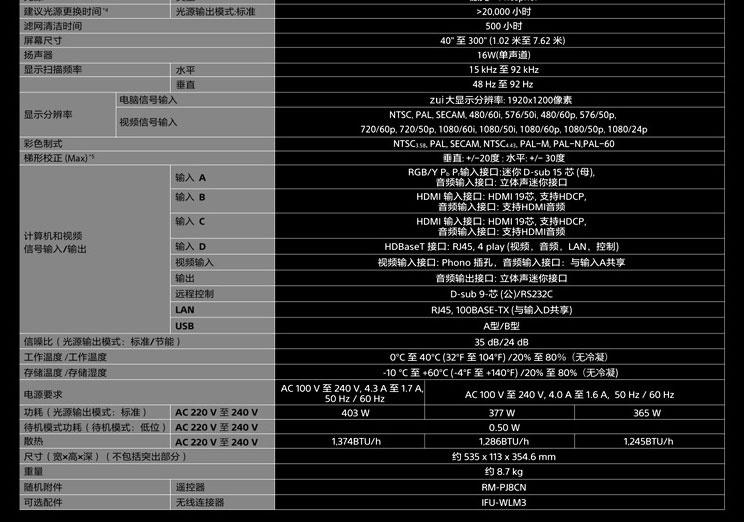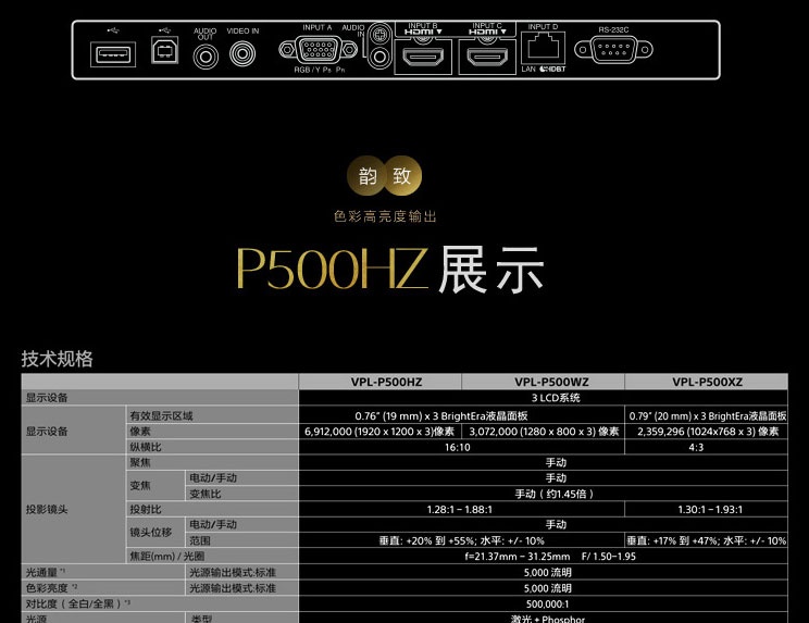 索尼 VPL-P500HZ (1920*1200dpi /5000流明) 激光投影机