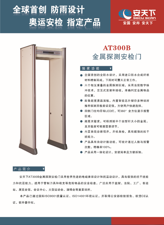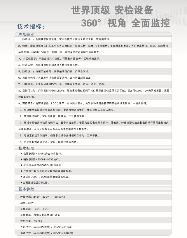| 精度 | 最高灵敏度在门的正中间可以检测到一根大头针(或者1/2)回型针,可以做到走一百次检测到一百次,不会漏报和串报。也可以在排除皮带扣、皮鞋、文胸的影响,检测到150克以上的铜、铝、锌等金属或者管制刀具和枪 |