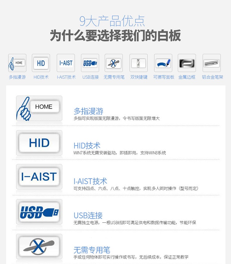 | 包装清单 | 电子白板、软件光盘、保修卡、安装配件、手写笔、触控线 |