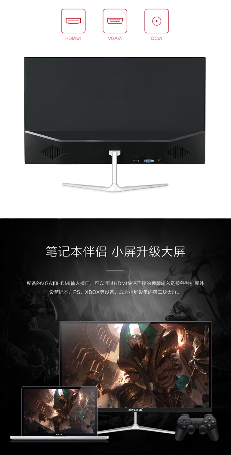 现代e派 W2402T 23. 8英寸 无边 VGA+HDMI 液晶显示器(金属底座)黑色