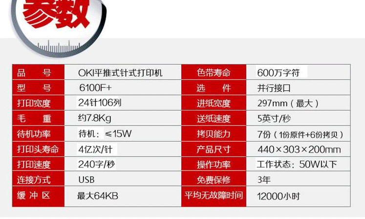 | 可靠性 | 打印头寿命:3亿次/针 |