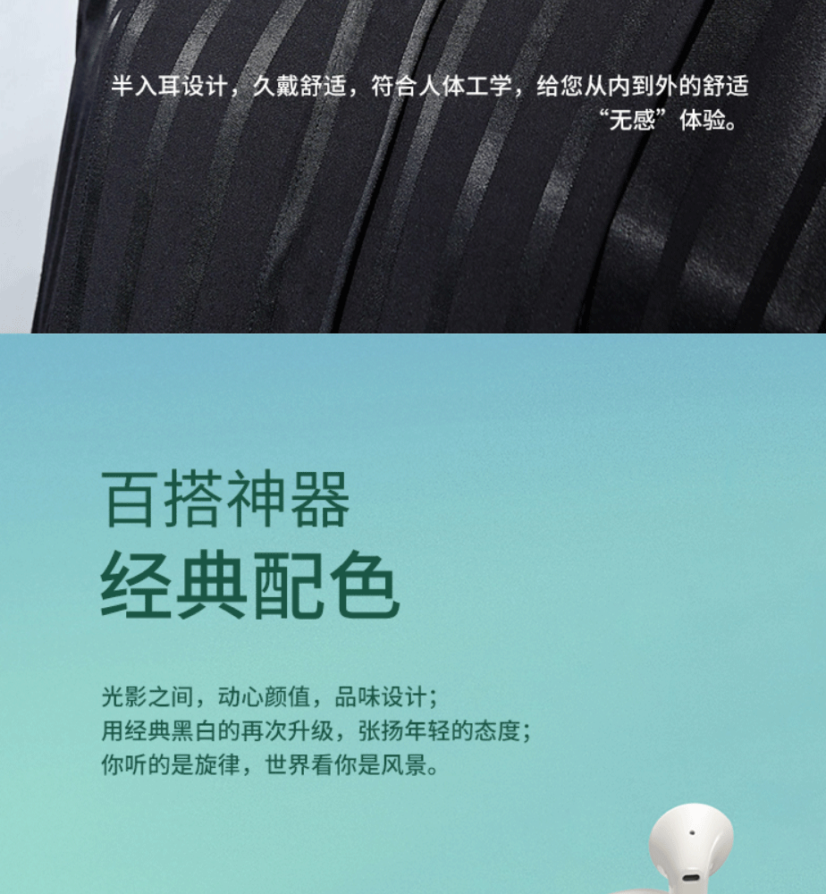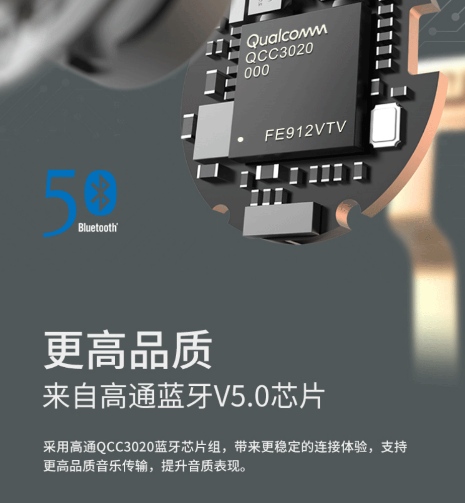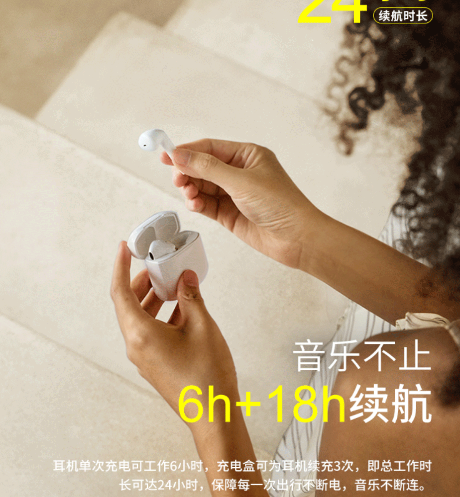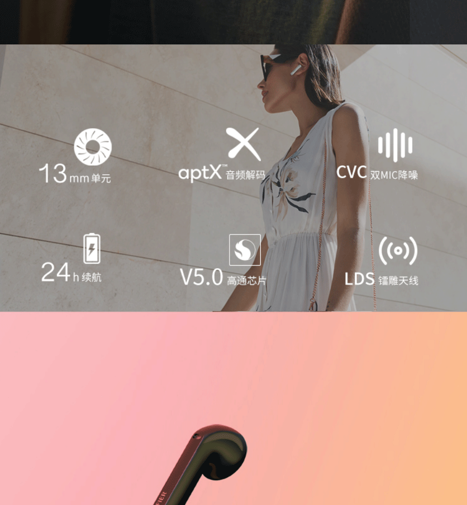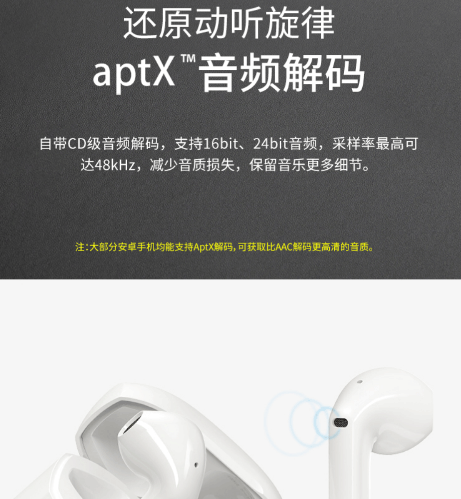 入耳设计,高通蓝牙5.0,aptx音频解码,24h续航,防水设计,佩戴舒适