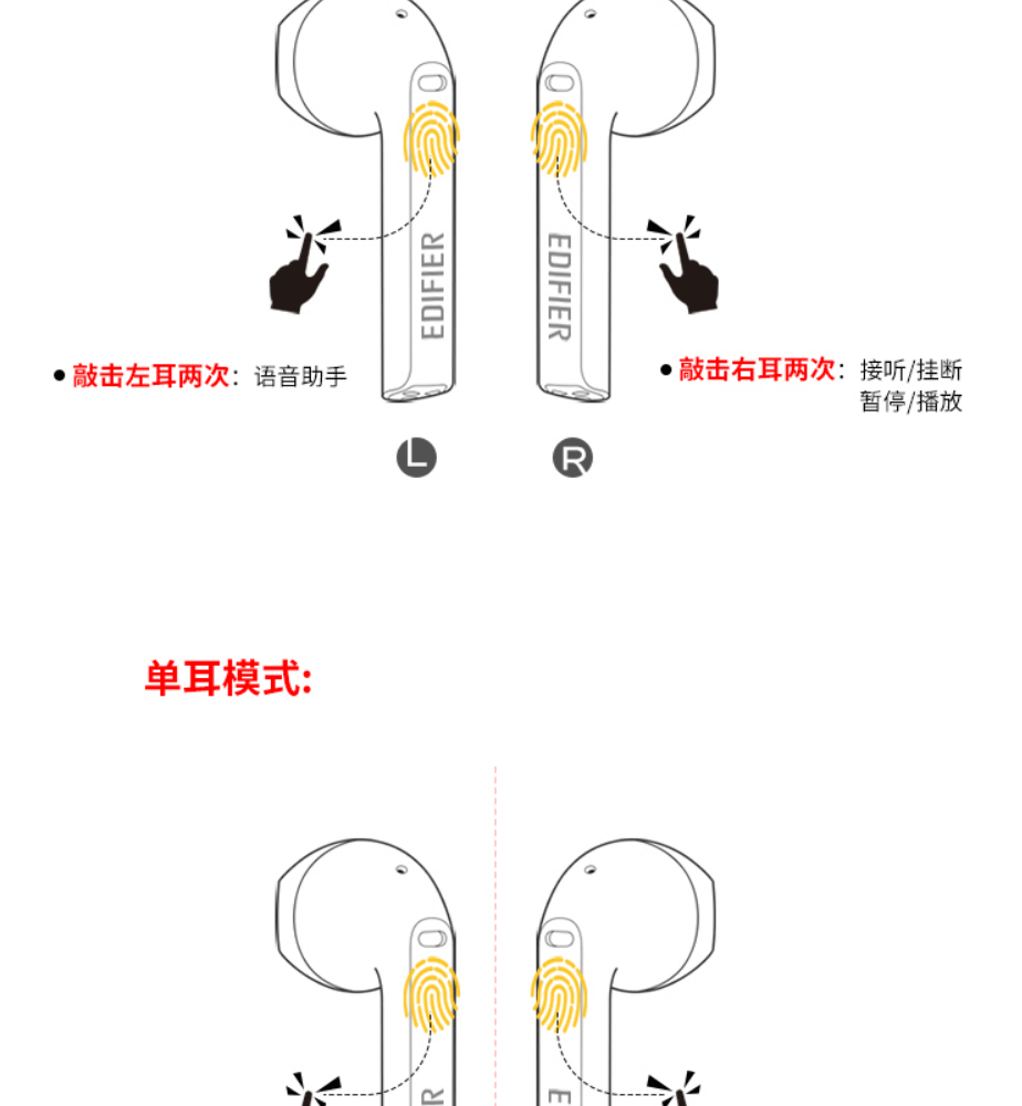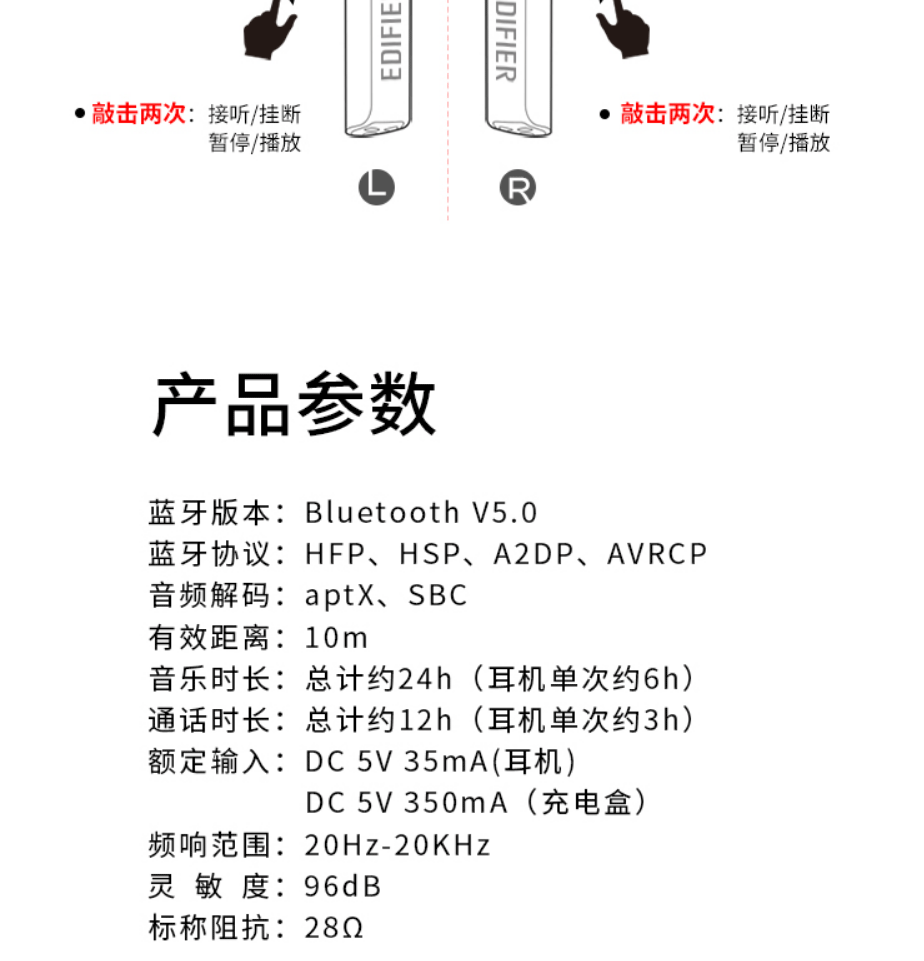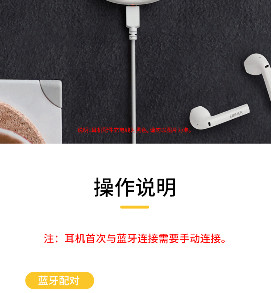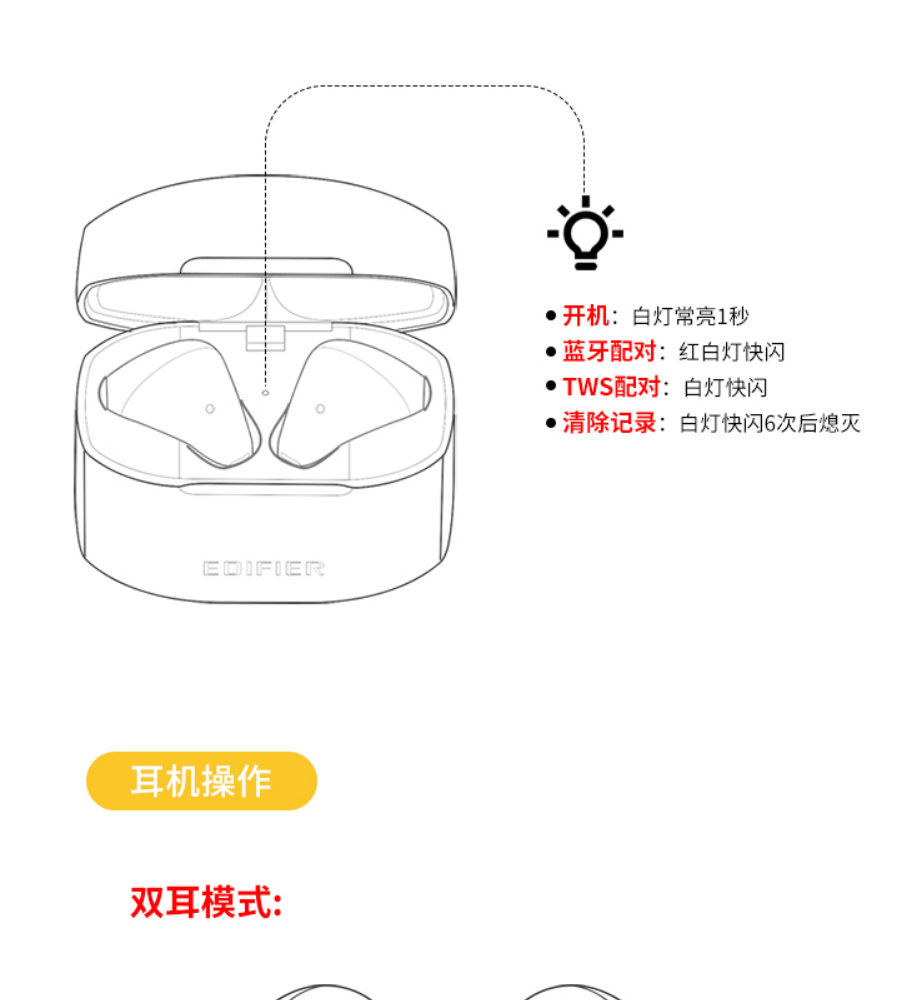 | 包装清单 | 耳机× 2、充电盒× 1、USB充电线× 1、耳机说明书&保修卡× 1 |