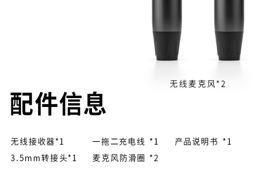 | 包装清单 | 麦克风*2、无线接收器*1、一拖二充电线*1、3.5MM转接头*1、麦克风防滑圈*2、产品说明书*1、保修卡*1 |