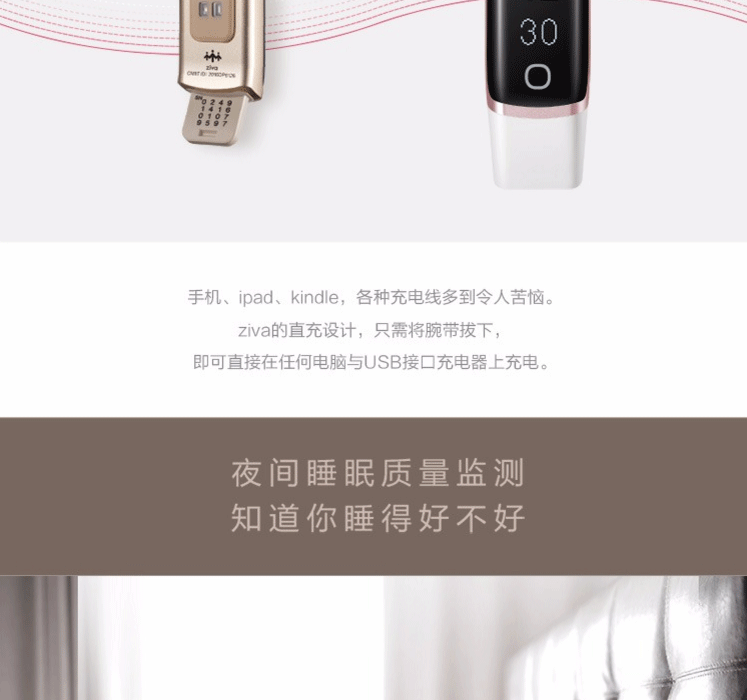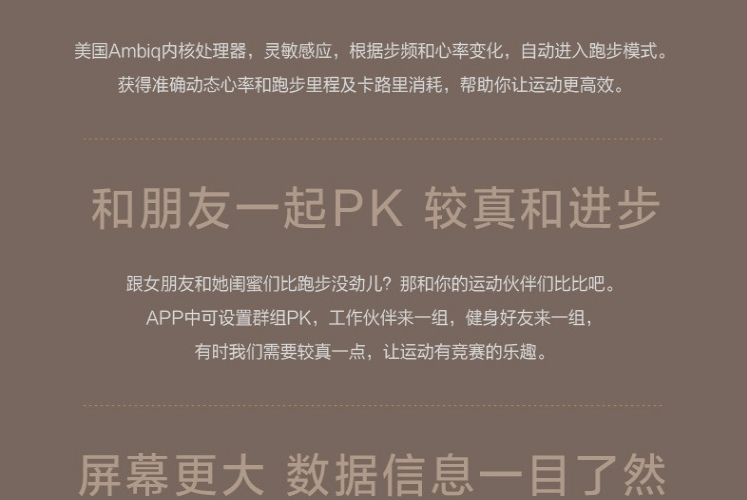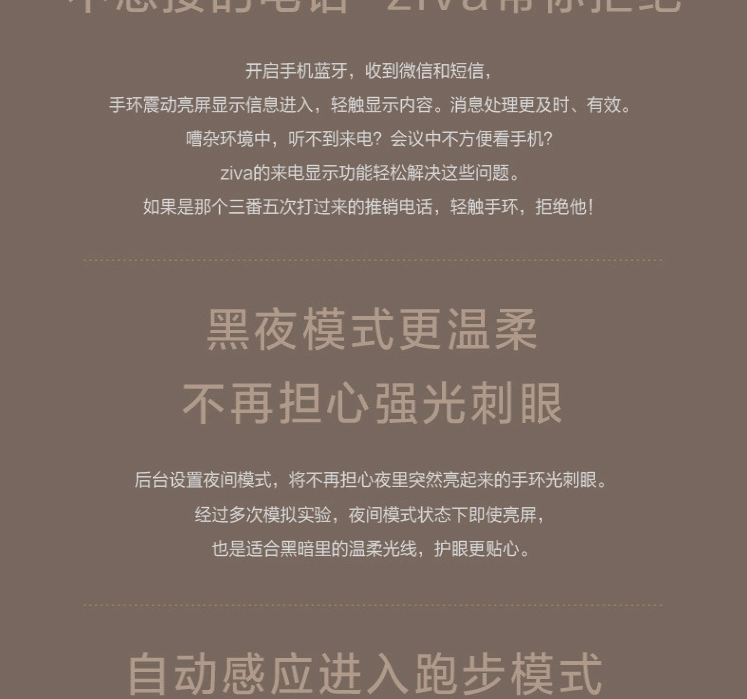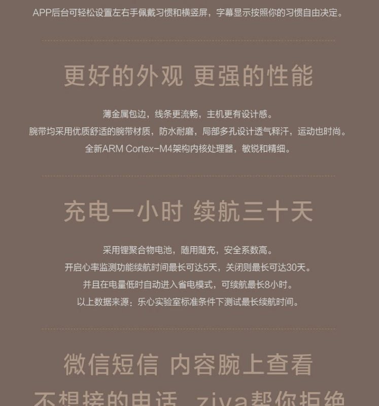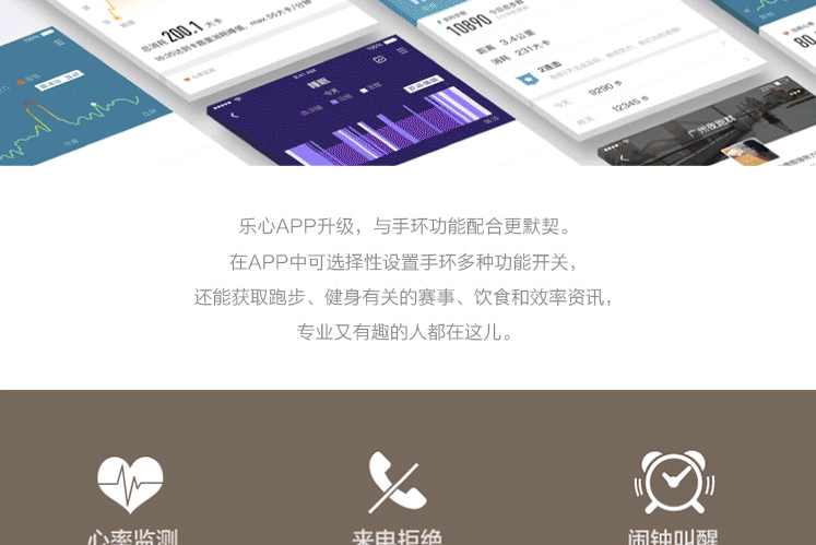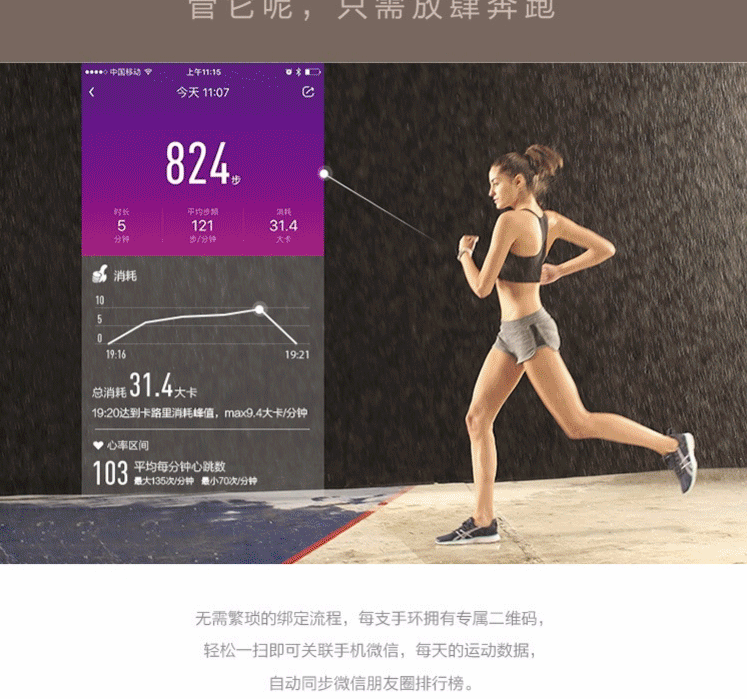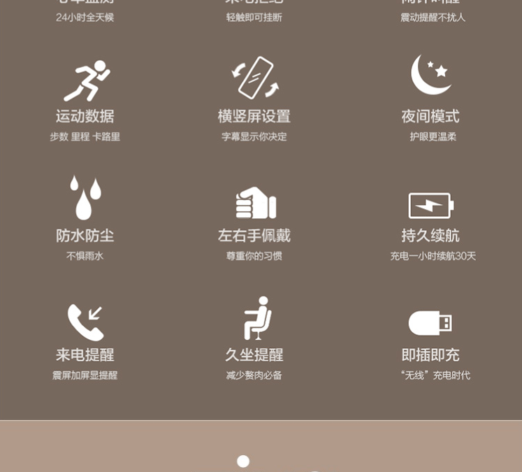 24小时心率监测,自动感应进入跑步模式,好友PK,拒接来电,睡眠检测,防水续航棒
