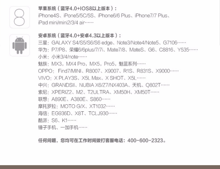 | 兼容系统 | iOS系统(蓝牙4.0+iOS 8以上版本)Android系统(蓝牙4.0+Android 4.3以上版本) |