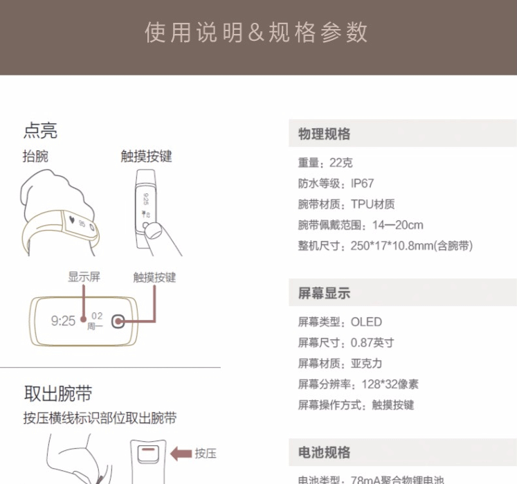 | 其它特点 | 腕带佩戴范围:14—20cm |
