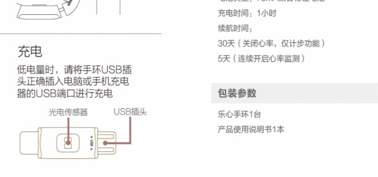 | 待机时间 | 30天(关闭心率,仅计步功能)5天(连续开启心率监测) |
