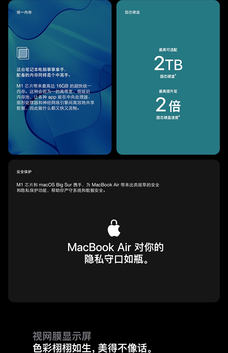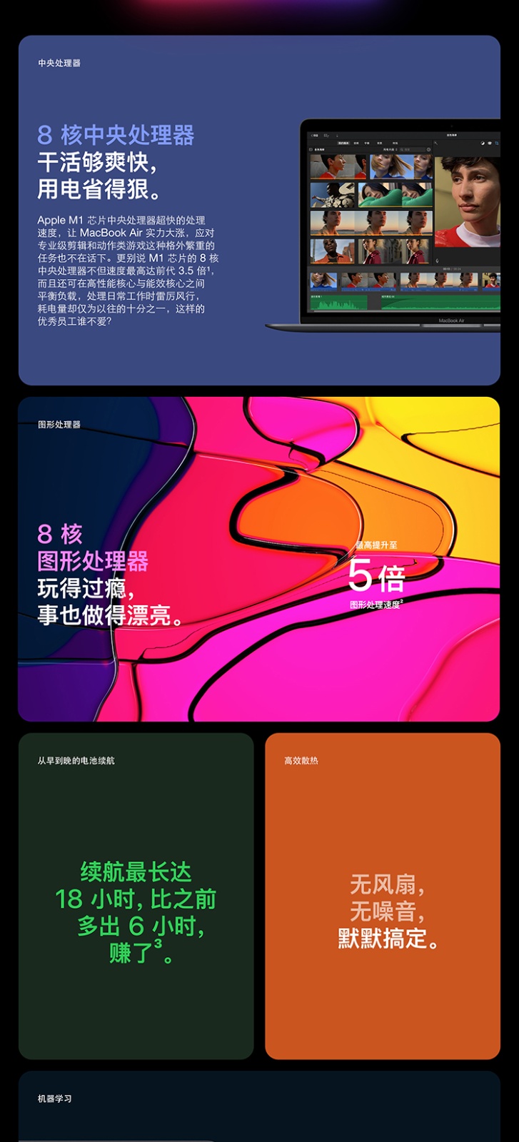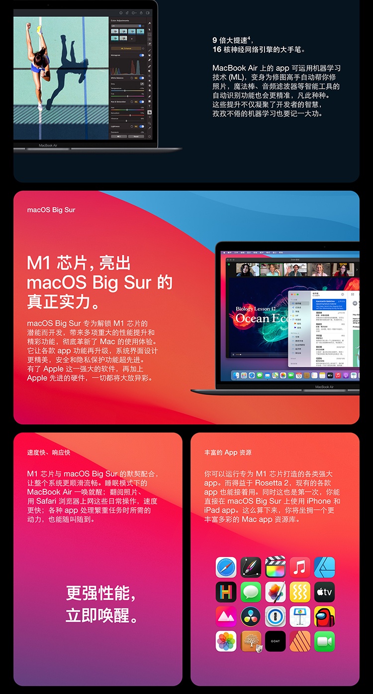 Apple M1 芯片,性能突飞猛进,续航更加持久,运行安静无声。