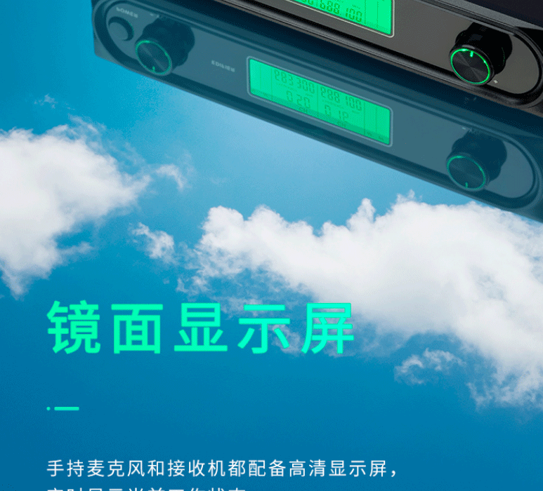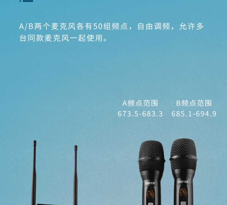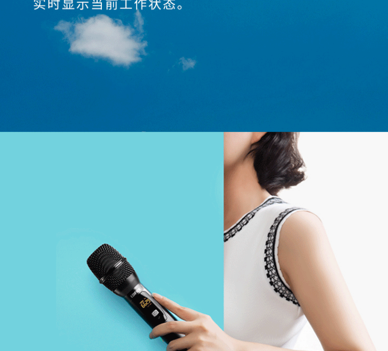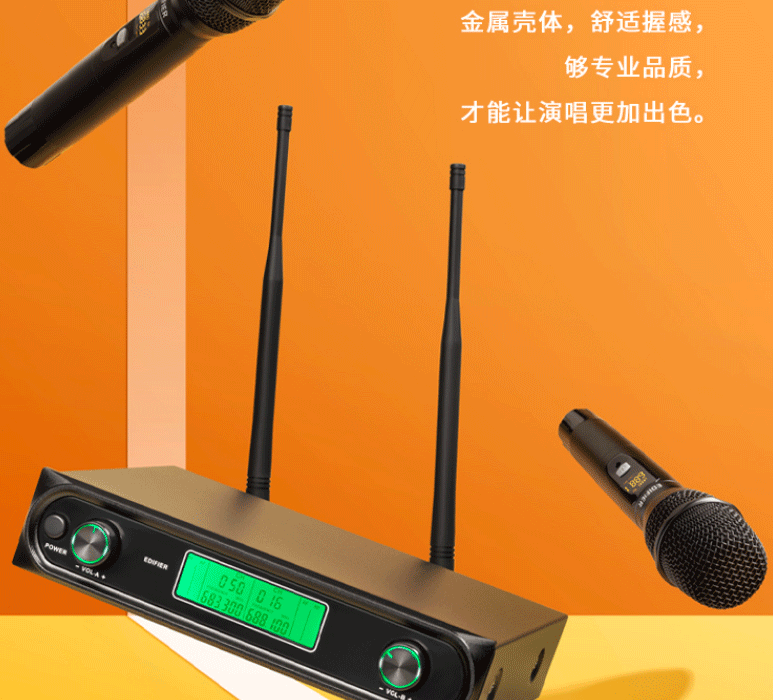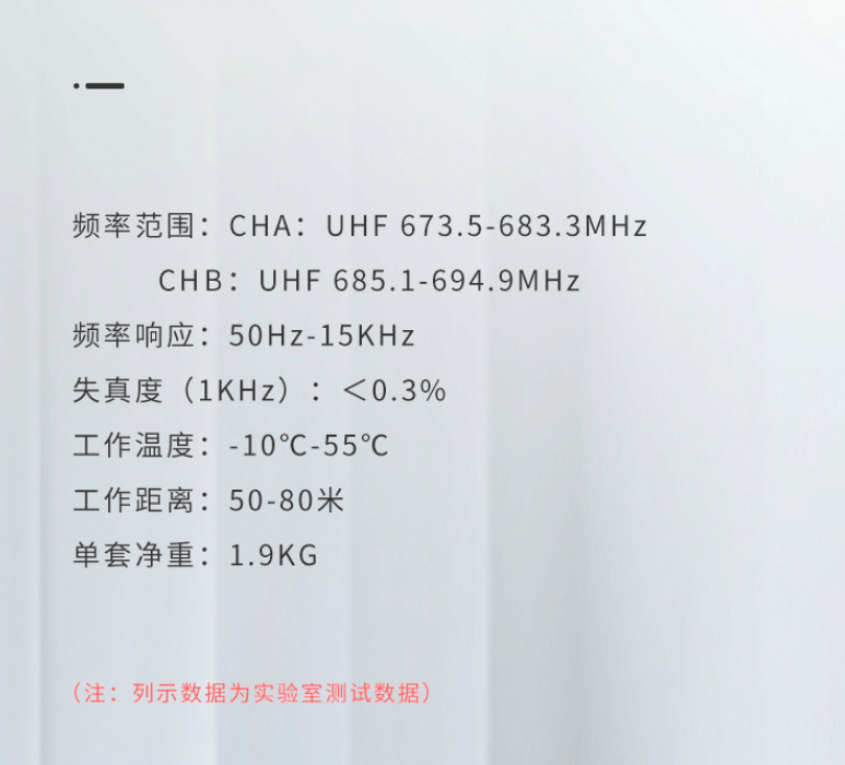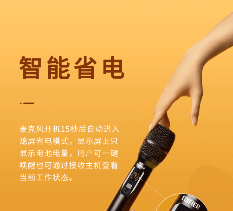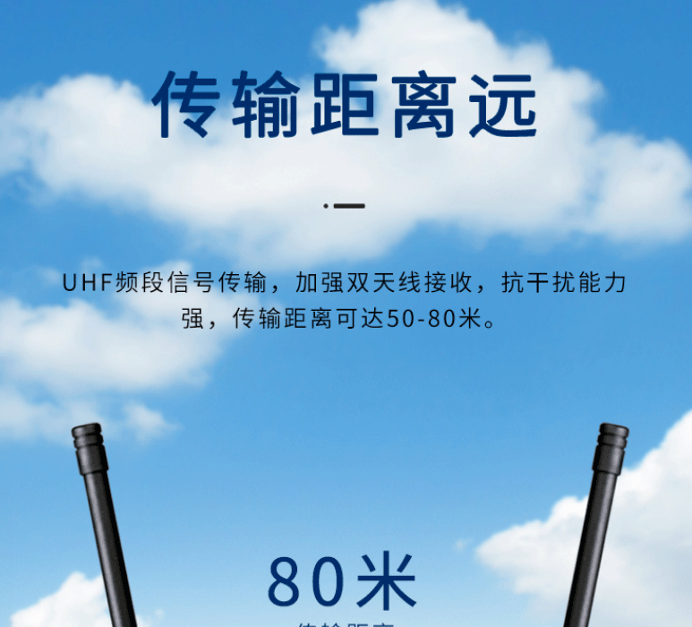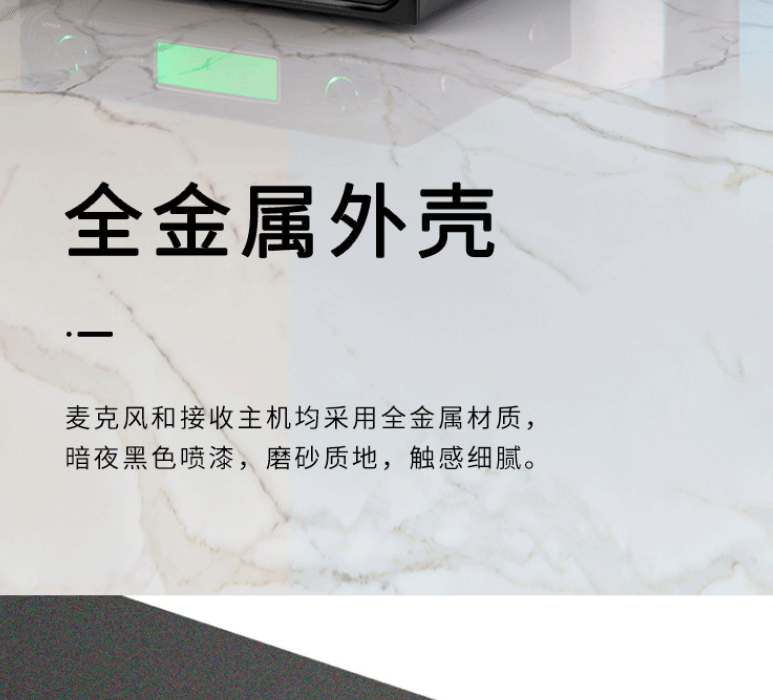 UHF频段信号传输,加强双天线接收,抗干扰能力强,传输距离可达50-80米 麦克风和接收主机均采用全金属材质,暗夜黑色喷漆,磨砂质地,触感细腻。 麦克风开机15秒后自动进入省电模式,显示屏上只显示电池电量,用户可一键唤醒,也可通过接收主机查看当前工作状态。 A/B两个麦克风各有50组频点,自由调频,允许多台同款麦克风一起使用。 手持麦克风和接收机都配备高清显示屏,实时显示当前工作状态 只要带MIC输入以及卡侬接口的设备,都可连接使用。即插即用,自动配对,无需繁琐调试。 金属网罩可有力保护拾音