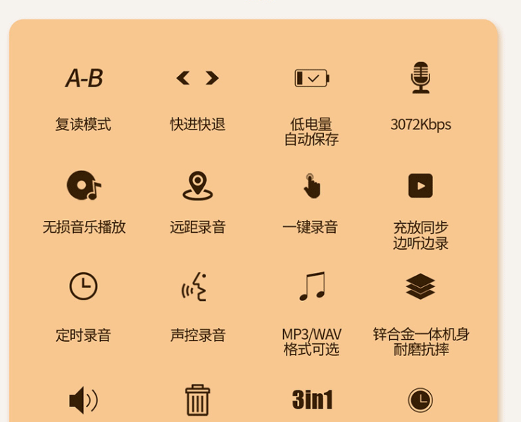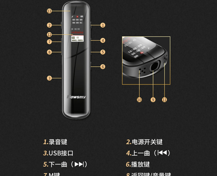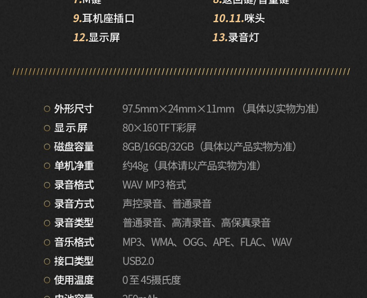 | 包装清单 | 主机×1、耳机×1、USB数据线×1、说明书×1、三包凭证×1、合格证×1 |
