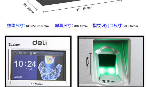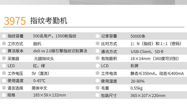 经典款,360度全方位指纹识别,识别时间小于1秒,SD卡直插,真人语音功能,自动生成考勤报表。