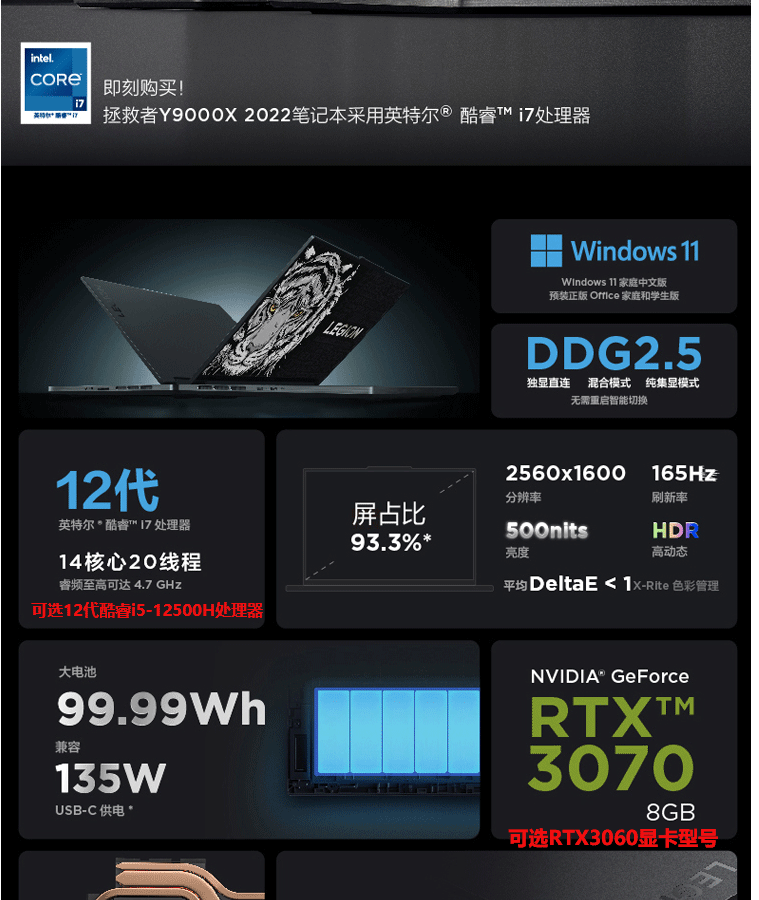 拯救者 Y9000X 2022(I7-12700/16G/1TSSD/3060-6G/钛金灰/16寸)联想笔记本