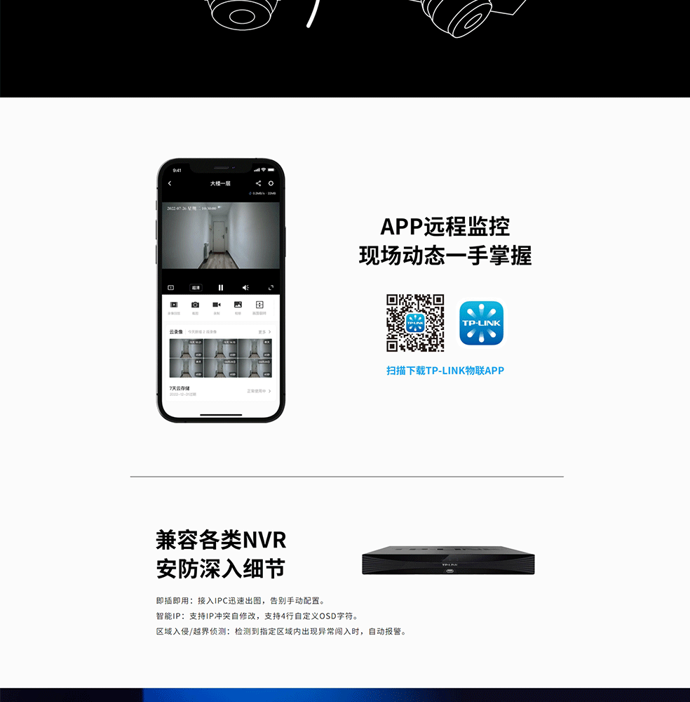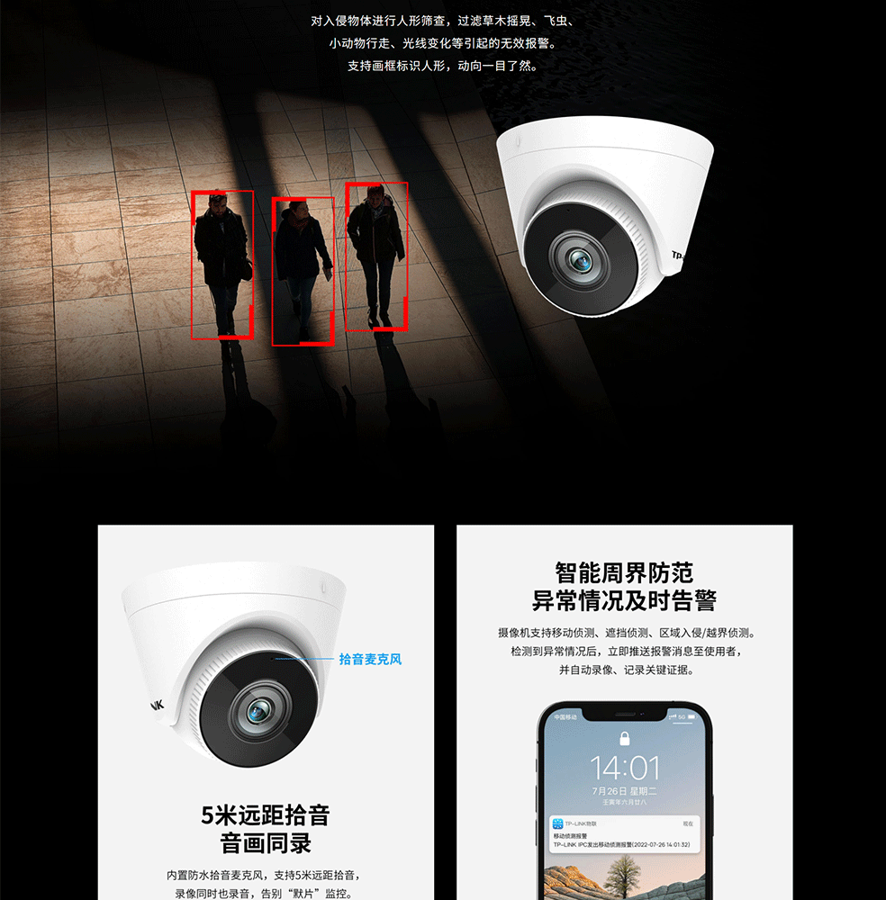 | 智能报警 | 移动侦测,视频遮挡,人形检测 |