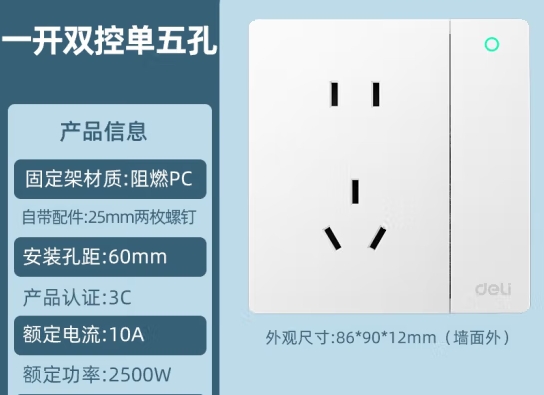 得力 LX906-17B 一开双控单五孔开关插座 CPP袋装(珍珠白)(个)